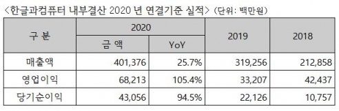한컴 관계자는 "창사 이래 최초로 매출액 4천억원대를 돌파했다"며 "2018년부터 매해 1천억원 규모로 성장함에 따라 3년 연속 연매출액의 앞 자리수를 갈아치웠다"고 말했다.