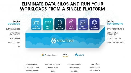 스노우플레이크는 클라우드 기반 데이터 플랫폼인 '스노우플레이크'를 보유하고 있다. 이 플랫폼은 데이터를 안전하고 효율적으로 저장, 변환, 분석할 수 있도록 지원한다. 서비스형 소프트웨어(SaaS) 형태로 제공되며, 플랫폼 상에서 데이터의 수요자와 공급자를 연결하는 데이터 공유 중개가 가능하다.