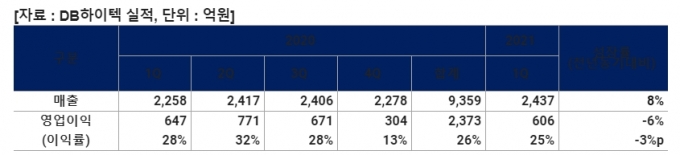 DB하이텍은 1분기 매출 2천437억원으로 전년동기대비 8% 증가하며, 분기 사상 최대치를 기록했다고 14일 밝혔다.