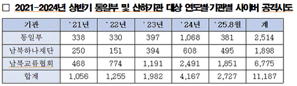 30일 외교통일위원회 소속 홍기원 더불어민주당 의원(평택갑)이 통일부로부터 제출받은 자료에 따르면, 통일부와 산하기관(북한이탈주민지원재단, 남북교류협력지원협회)에 대한 사이버 공격 시도는 지난 2021년부터 올해 8월까지 1만1187건에 달하는 것으로 집계됐다.